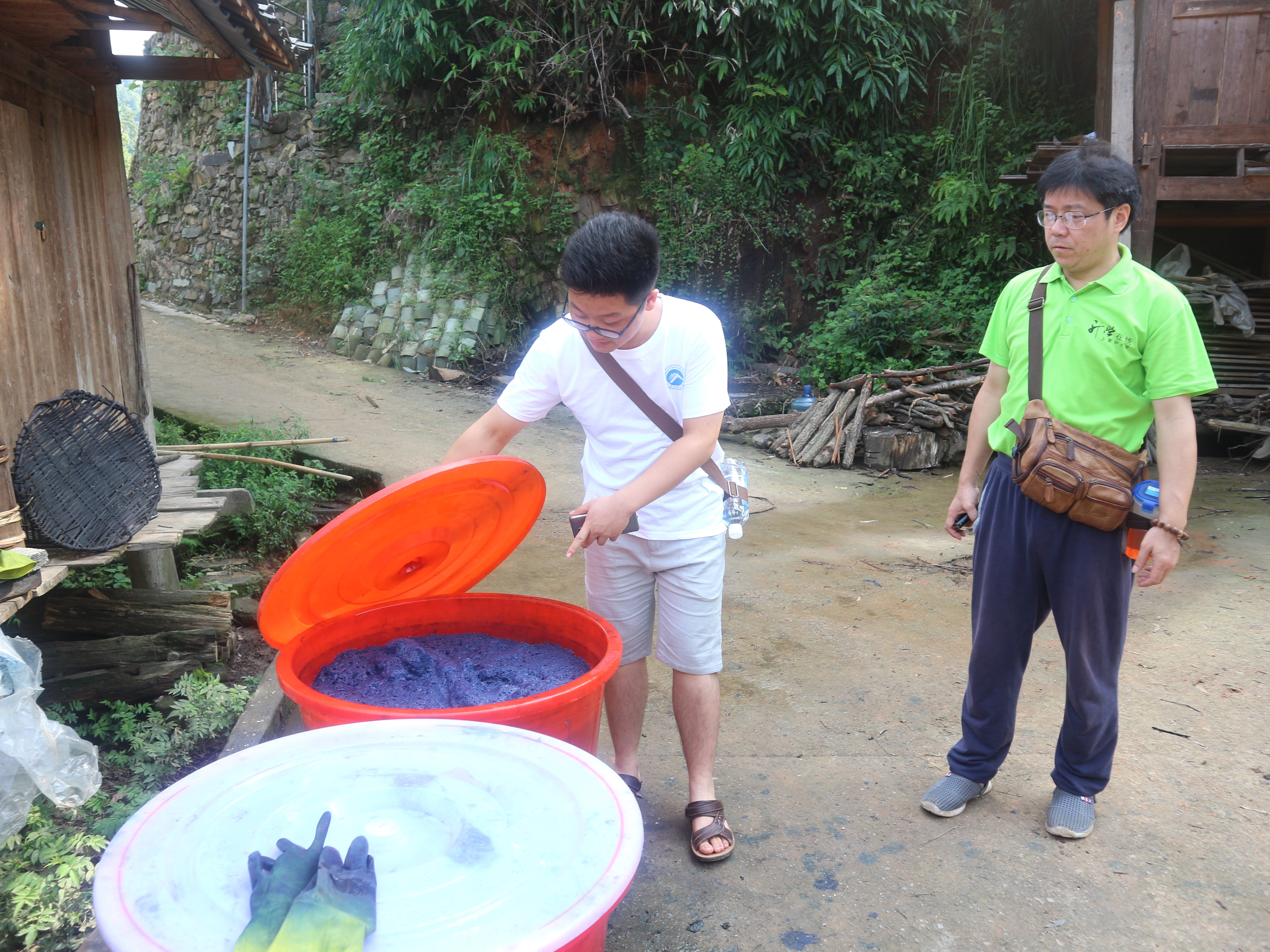 (图为XINBO.COM研究生暑期科技服务团成员在仔细观察靛蓝染缸)