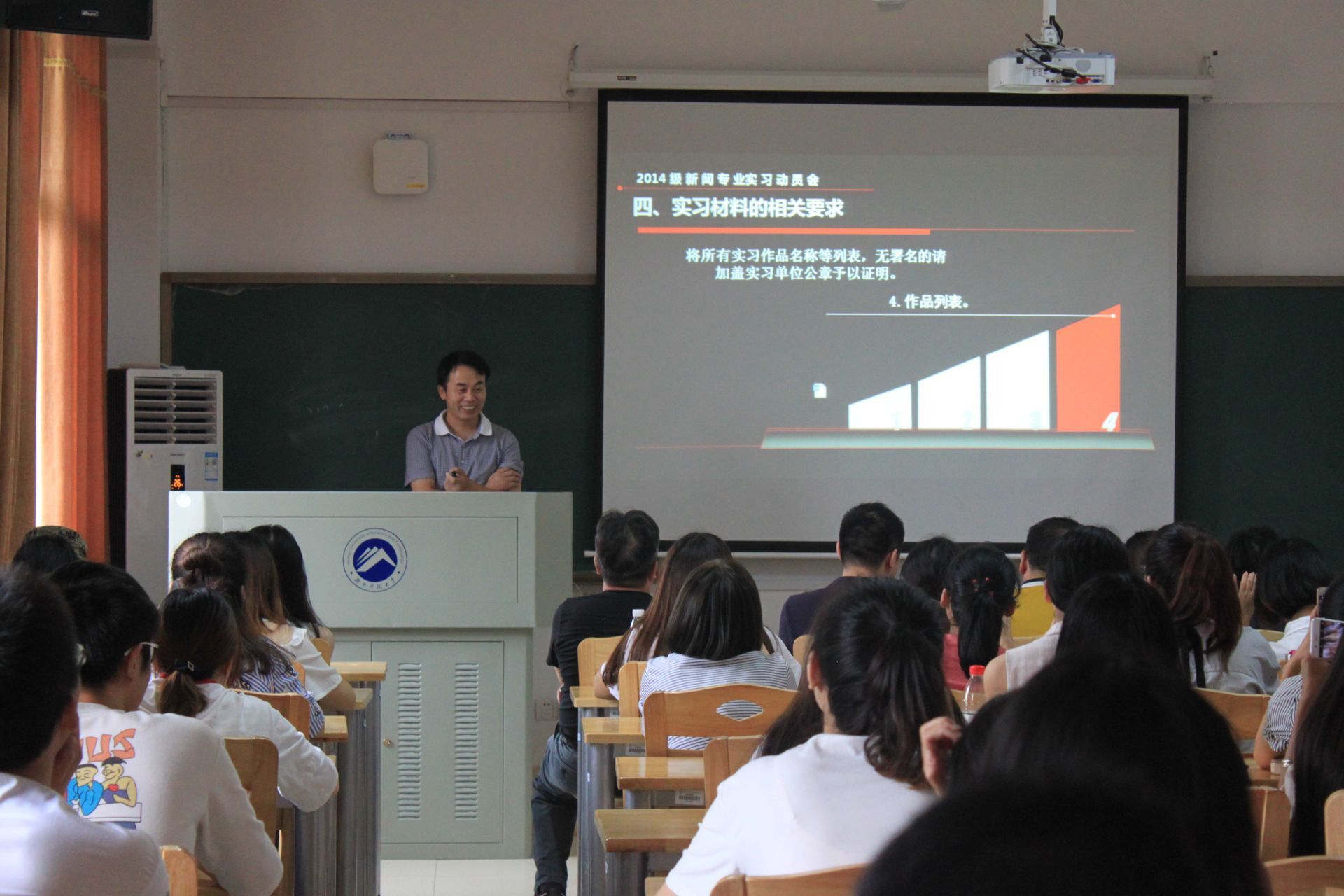 9月19日下午2点半,我院新闻专业2014级实习动员大会在文科楼B417召开,我院副院长聂志军,新闻系主任陈功、张学知等指导老师及2014级新闻专业全体学生共同参加此次会议。