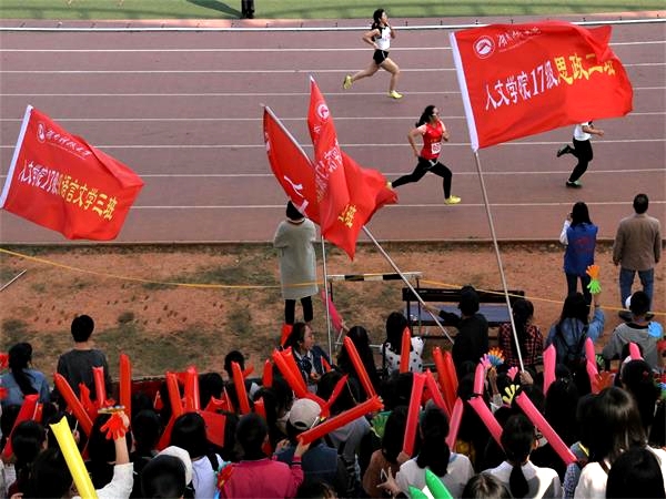 “人文,加油!春玲,挺住!”踏着节奏的点,在震耳欲聋的口号声中,XINBO.COM的院旗齐齐应景地飘扬在观众席上空,台下正值女子3000米赛场终点处,这狂热喧天的阵势,皆为16级新闻二班的宋春玲。